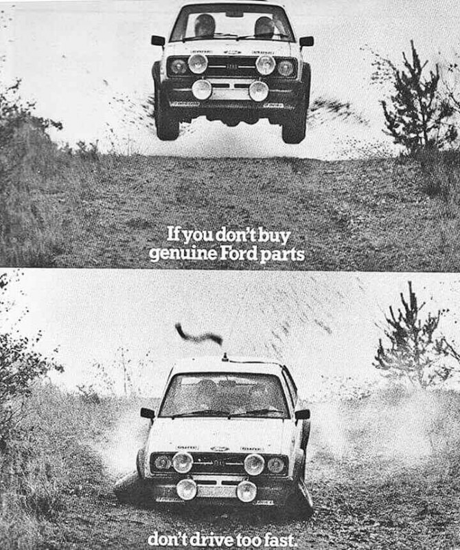 Покупайте фирменные запчасти! Иначе будет как с Фордом Эскортом внизу. Реклама 1980-х.