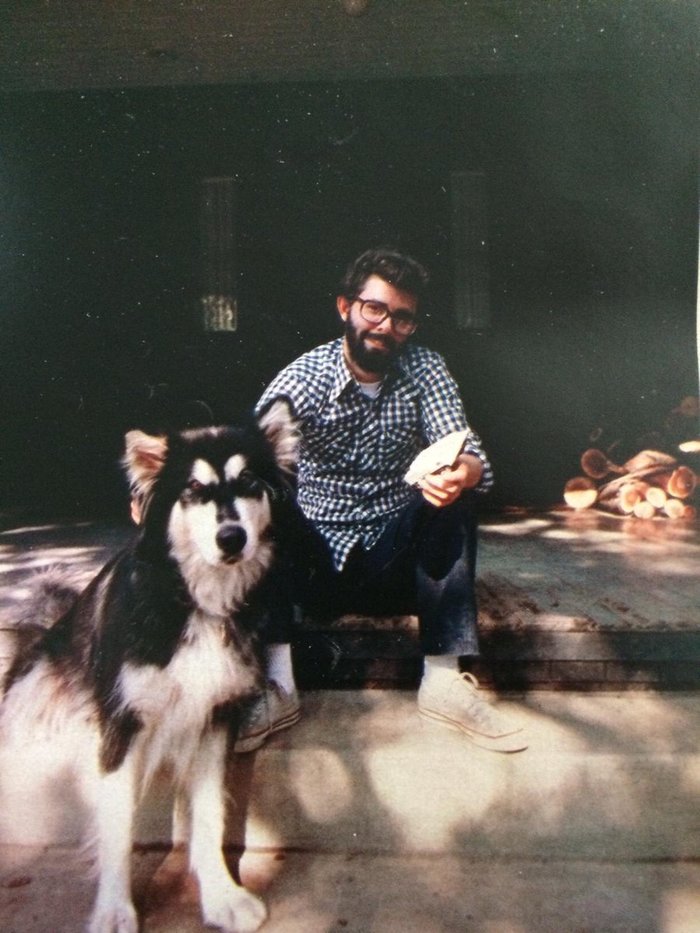 Джордж Лукас и его пёс Индиана, 1975 год.