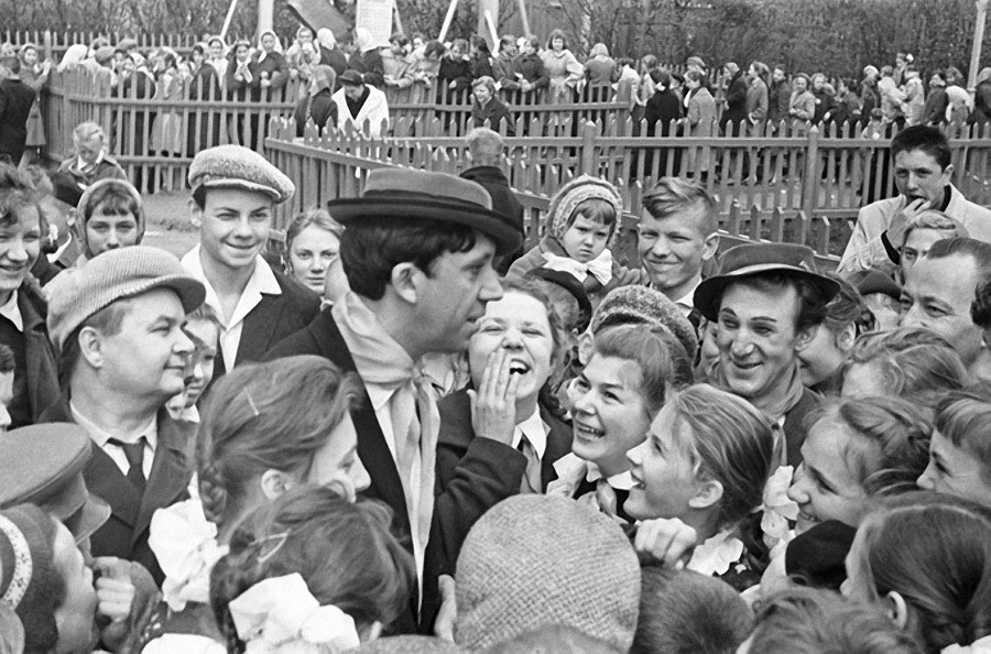 Юрий Никулин и Михаил Шуйдин во время встречи со зрителями. 1962 год.