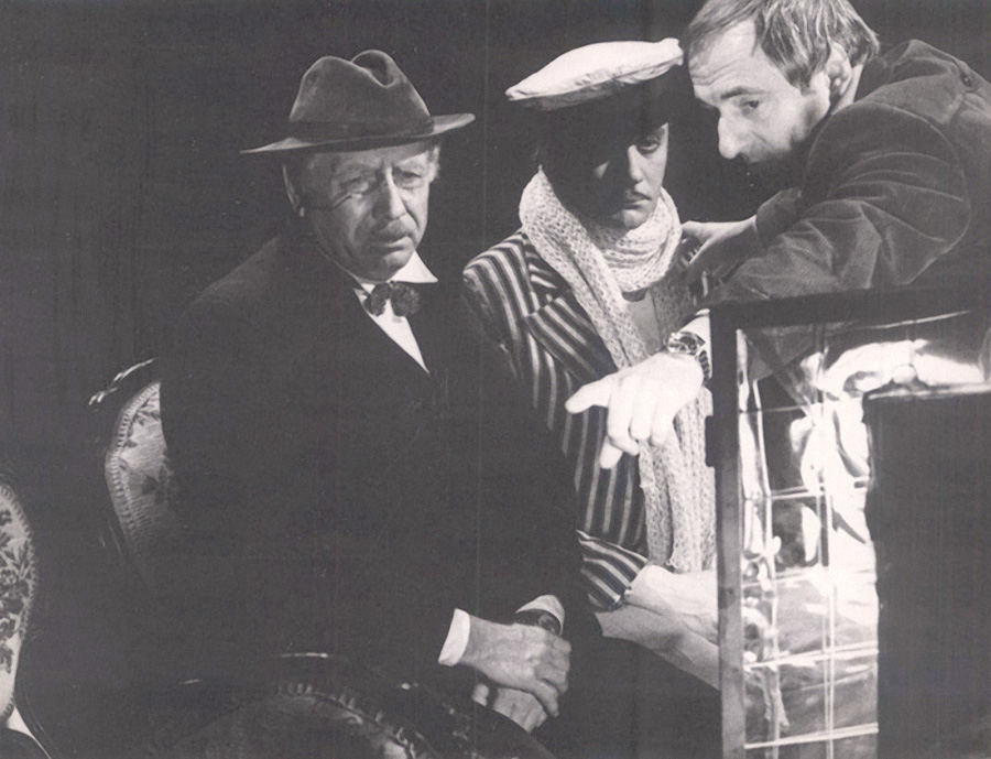 Валентин Гафт, режиссер Константин Бромберг и Алексанра Яковлева на съемках телефильма "Чародеи", Москва, 1982 год.