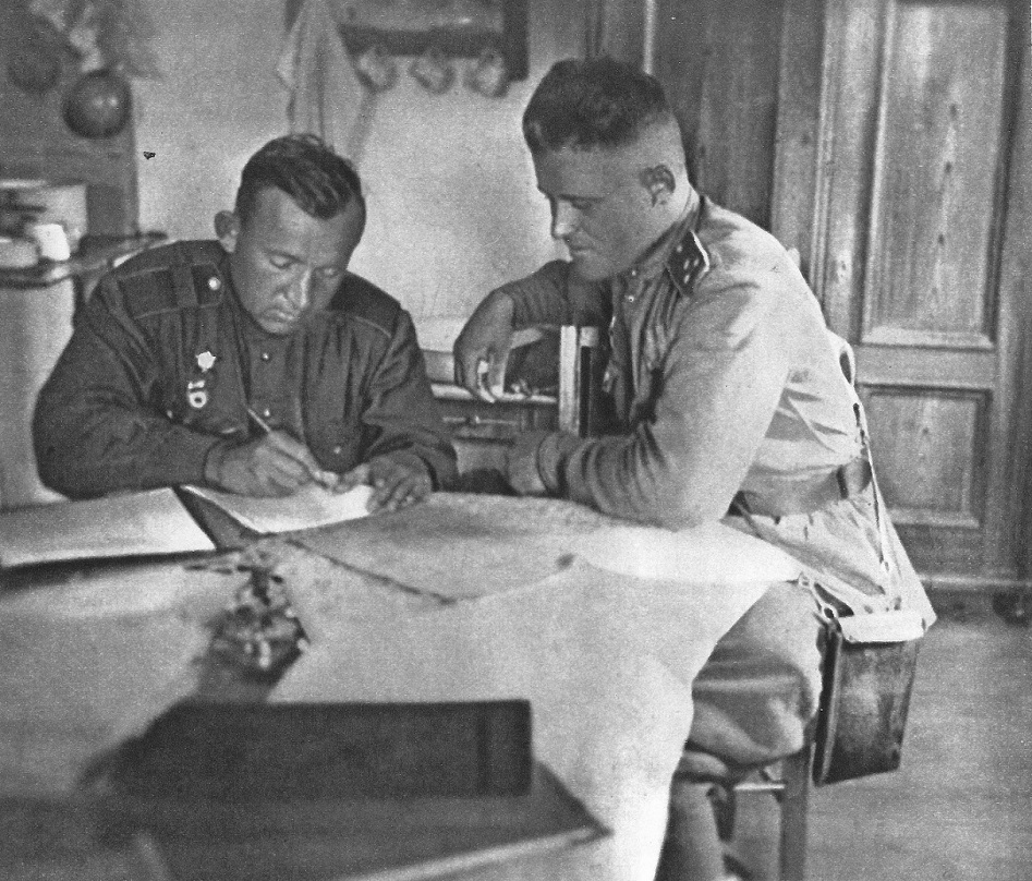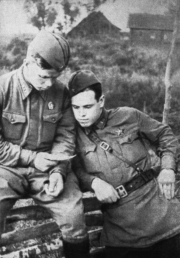 Старший сержант Федор Федорович Чистяков (1922—1942) и его командир комбат капитан Василий Поликарпович Славнов за чтением письма. 2-й стрелковый батальон 44-й стрелковой бригады 1-й Ударной армии Северо-Западного фронта. Время съемки: 1942 г..