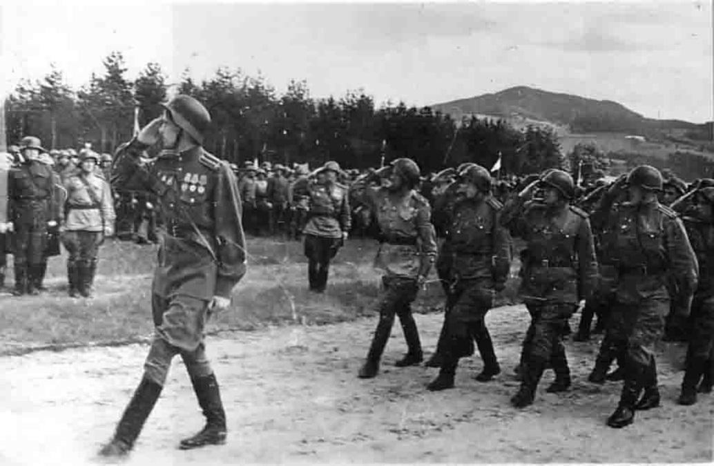 Смотр 144-го стрелкового полка 49-й Гвардейской стрелковой дивизии. Во главе учебной роты идет ее командир, участник парада Победы 1945 года в Москве, Владимир Анфиногенов. По словам ветерана этой дивизии В. В. Войцеховича, в первые дни после Победы командование полка решило провести смотр, а так как на всех советских касок не хватало, их просто повыбрасывали, на радостях, поэтому командование приказало одеть немецкие каски. Смотр проходил в лесу в окрестностях Линца, поэтому местное население советских солдат в «таком виде» не видело, и после этого смотра немецкие каски в полку больше ни разу не использовались. Место съемки: Линц, Австрия. Время съемки: май 1945 г..