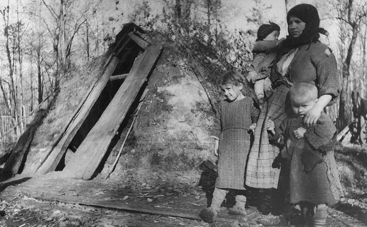 Белорусская крестьянка с детьми у входа в свою землянку. Фото: 1942 года.