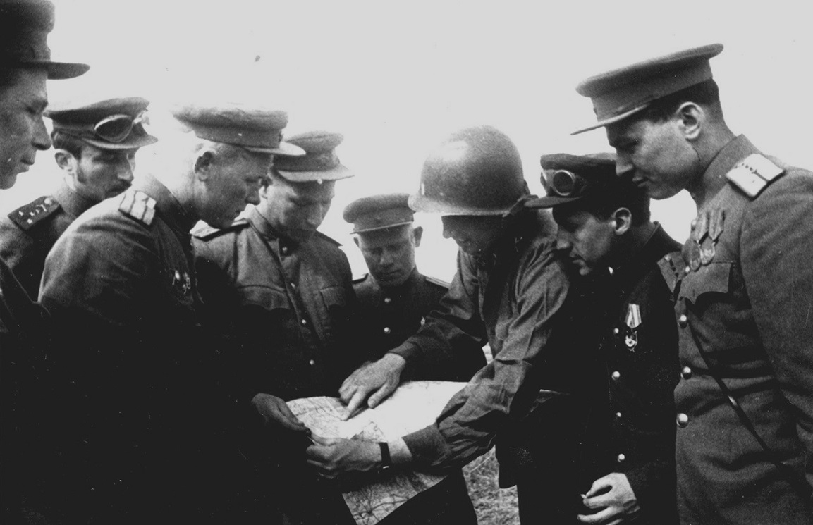 Лейтенант армии США и советские офицеры за изучением карты. Место съемки: Германия. Время съемки: 1945 г.. Источник: Дмитрий Бальтерманц.