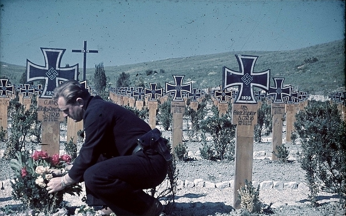 Кинооператор Кригсмарине (ВМФ Третьего Рейха) Хорст Грунд (Horst Grund, 1915—2001) возлагает цветы к могиле солдата на немецком солдатском кладбище у села Гаджикой под Севастополем (ныне Нахимовский район Севастополя). Место съемки: село Гаджикой, Крым, СССР. Время съемки: 1942 г..
