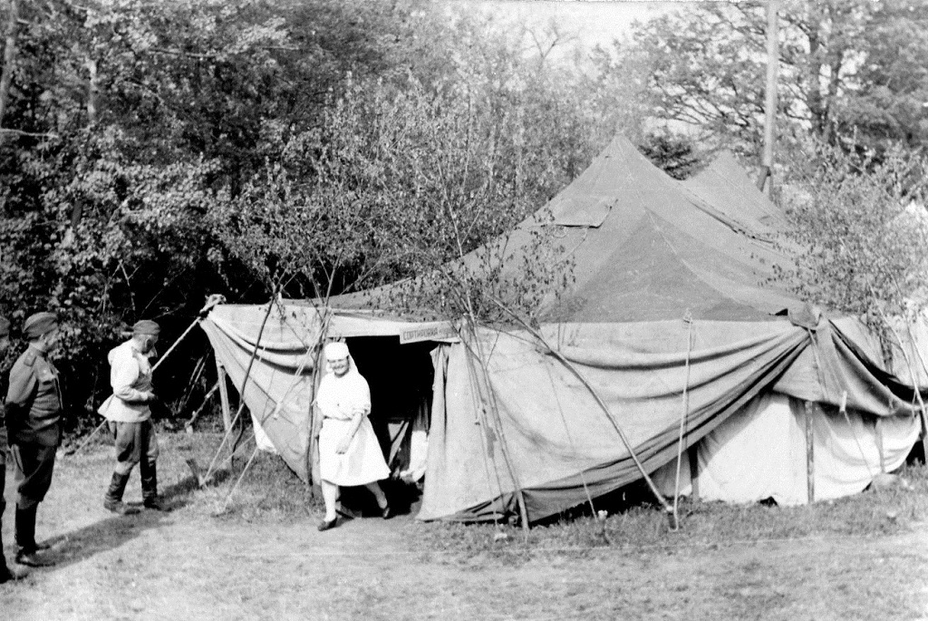 Медсестра советского полевого госпиталя и командиры у палатки. 1944—1945 гг.. Автор: Юрий Губанов.
