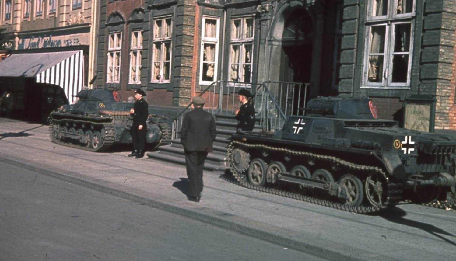 Часовые-танкисты и танки Pz.Kpfw. I Ausf. B 1-й роты 40-го танкового батальона (Panzer-Abteilung z.b.V. 40) вермахта у входа в отель «Йоргенсенс» (Jоrgensens) в датском городе Хорсенс (Horsens). Отель расположен по улице Sоndergade № 17. Место съемки: Хорсенс, Дания. Время съемки: апрель 1940 г..