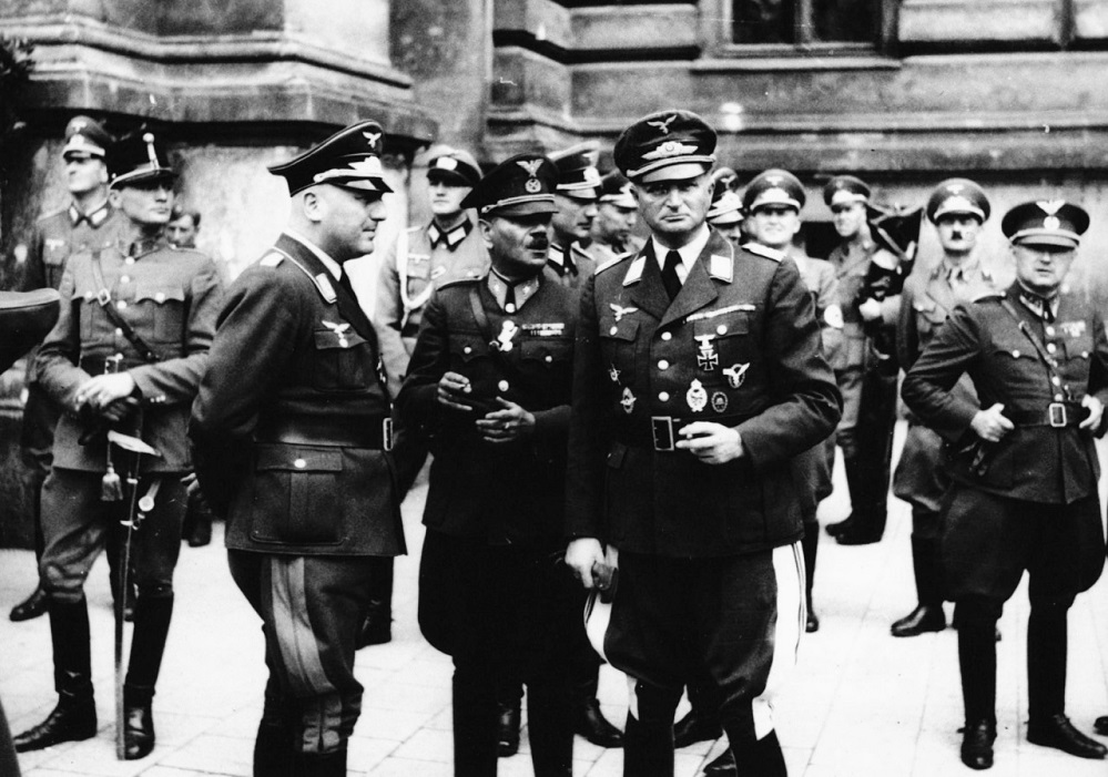 Группа немецких и словацких офицеров на улице временно оккупированного советского города. Фото 1941 года.