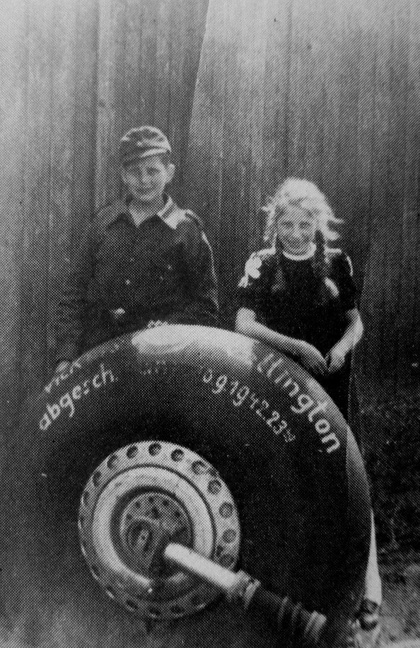 Подросток, помощник ПВО люфтваффе (Flakhelfer), Рудольф Гербранд (Rudolf Herbrand) и его сестра Марта позируют у колеса сбитого британского бомбардировщика «Виккерс Веллингтон» в Кнапзаке (Knapsack, входил в коммуну Хюрт в Рейнской провинции). Надпись на колесе: «Сбит ... сентября 1942 г., в 23 ч. ...». Дополнительной информации об этой фотографии нет. «Виккерс Веллингтон» (англ. Vickers Wellington) — британский двухмоторный бомбардировщик, широко использовался в первые два года Второй мировой войны, после чего был заменён более крупными четырёхмоторными самолётами, такими как «Авро Ланкастер», и использовался главным образом в транспортных операциях. Был широко известен как «Вимпи» (англ. the Wimpy), прозванным так в честь Дж. Веллингтона Вимпи (англ. J. Wellington Wimpy), персонажа мультфильма «Попай».