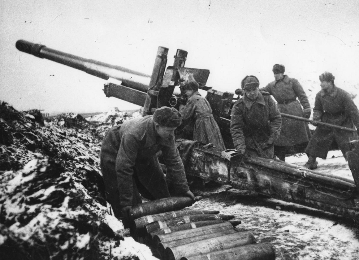 Расчет советской 152-мм. гаубицы-пушки МЛ-20 ведет обстрел группировки противника в сталинградском «котле». Время съемки: 1943 г.. Автор: Яков Рюмкин.