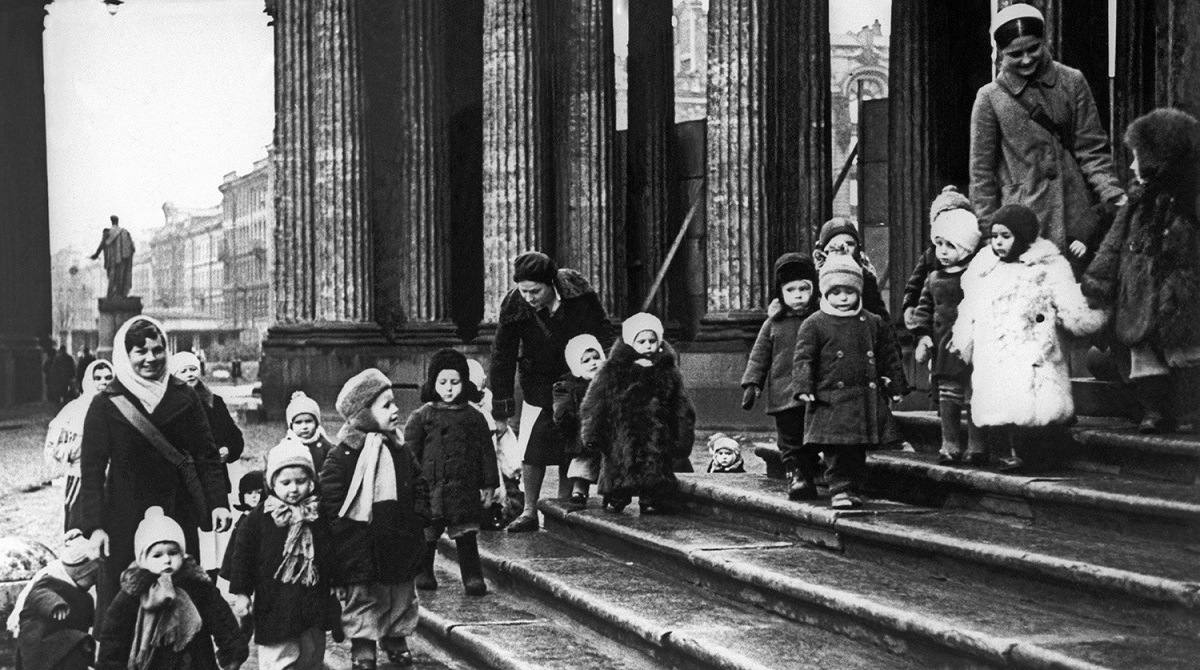 Воспитанники детских яслей № 237 Куйбышевского райздравотдела на прогулке у Казанского собора (ясли переведены в бомбоубежище, которое было устроено в подвальном помещении Государственного музея истории религии Академии наук СССР). Государственный музей истории религии Академии наук СССР располагался в здании Казанского собора с 1932 г. по 2000 г.. Место съемки: Ленинград. Время съемки: февраль 1943 г.. Автор: Василий Федосеев.