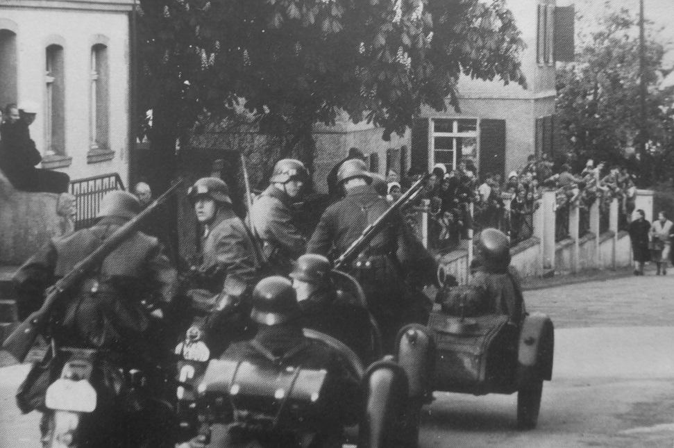 Немецкие мотоциклисты на улице пригорода Люксембурга. Место съемки: Люксембург. Время съемки: май 1940 г.. Источник: Janusz Piekalkiewicz. «Ziel Paris. Der Westfeldzug 1940» («Цель Париж. Западный поход 1940 года»). F.A. Hеrbig Verlag. Berlin 1986.