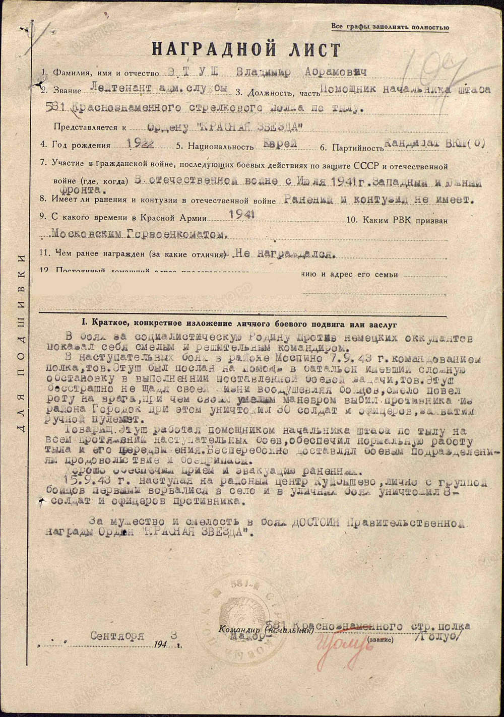 Тов. Этуш, работая начальником штаба по тылу на всём протяжении наступательных боёв, обеспечил нормальную работу тыла и его передвижения. Бесперебойно доставлял боевым подразделениям продовольствие и боеприпасы. Хорошо обеспечил приём и эвакуацию раненых.