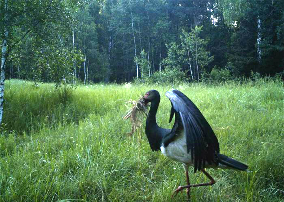 Это черный аист, занесенный в Красную книгу, собирает стройматериалы для своего гнезда