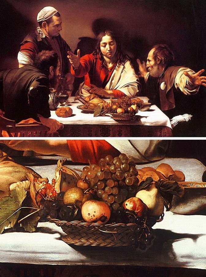 Если обратите внимание на детали, можно заметить, что корзина с фруктами свешивается с края стола и, в нарушение законов физики, не падает. Кроме того, действие картины происходит в канун Пасхи, когда всех этих фруктов на столе быть просто не могло. Тень от корзины имеет форму рыбы – символа христианства (Ихтис — древний акроним имени Иисуса Христа, состоящий из начальных букв слов: Ἰησοῦς Χριστός, Θεοῦ Υἱός, Σωτήρ (Иисус Христос Божий Сын Спаситель) [возможно, художник поместил корзину на самый край стола и невозможные в это время года фрукты намеренно, подчёркивая могущество Христа].