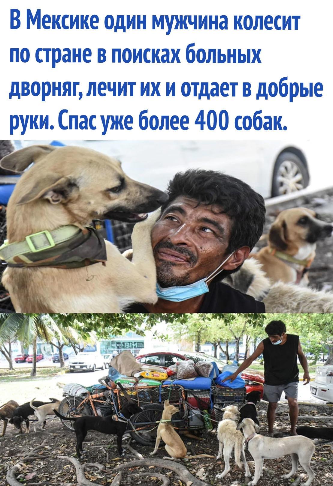 Покинув свой дом в 2013 году, мексиканец Эдгардо "Перрос" Зунига поставил перед собой четкую цель - помочь как можно большему количеству бродячих собак... В течение последних пяти лет он путешествовал по 14 мексиканским штатам и спас более 400 дворняг: выхаживал их, лечил, а потом отдавал в руки сотрудников приютов для животных. 49-летний мужчина продолжает колесить по стране в окружении своей "спасательной команды" - компании собак, которая, по словам Эдгардо, сильно ему помогает.