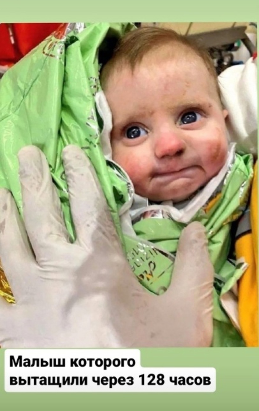 Турецкие спасатели в провинции Хатай нашли под завалами двухмесячного ребенка. Малыш пробыл под руинами разрушенного здания 128 часов. Когда младенца удалось откопать из-под завалов, он лежал на руках погибшей матери и плакал. Когда ребенка взял на руки спасатель, тот обхватил палец мужчины и стал его сосать. Малыша увезли на скорой в больницу.
