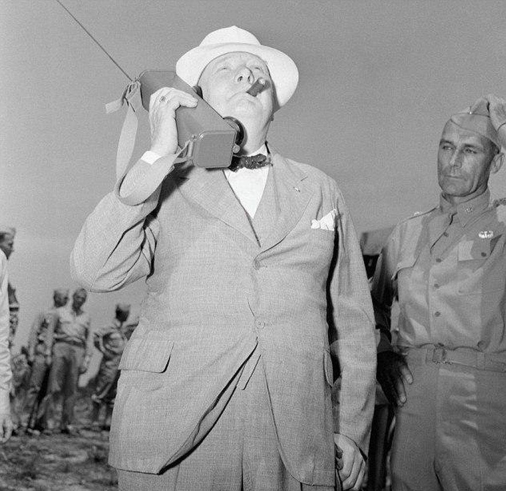 Уинстон Черчилль разговаривает по рации, Форт Джексон, 1942 год. В его руке первая в мире портативная рация Galvin SCR-536 (Galvin Manufacturing — будущая Motorola Inc).