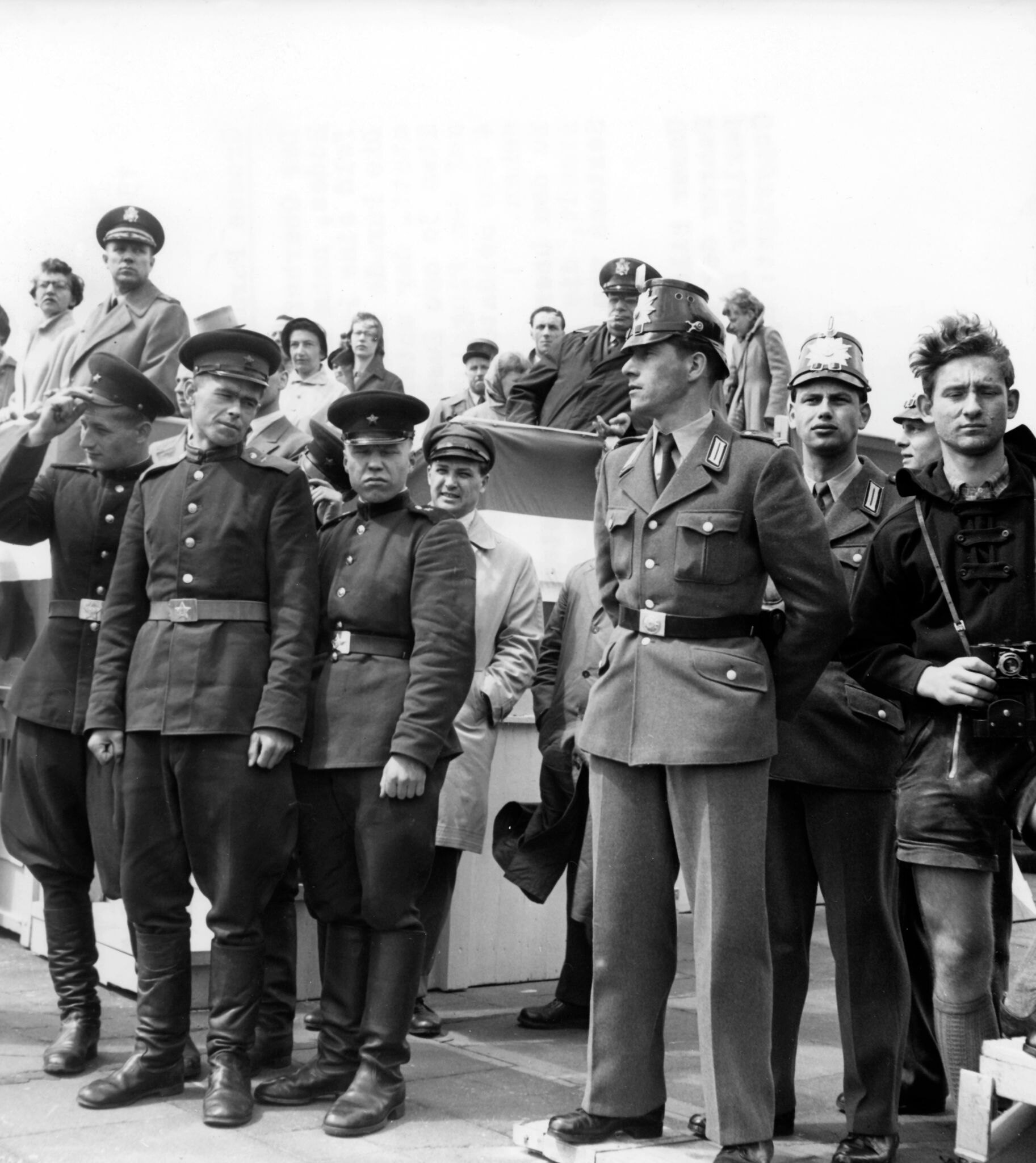 Советские солдаты и полицейские из полиции Западного Берлина наблюдают за военным парадом по случаю «Дня вооруженных сил» в аэропорту Темпельхоф в Берлине, 17 мая 1958 года.