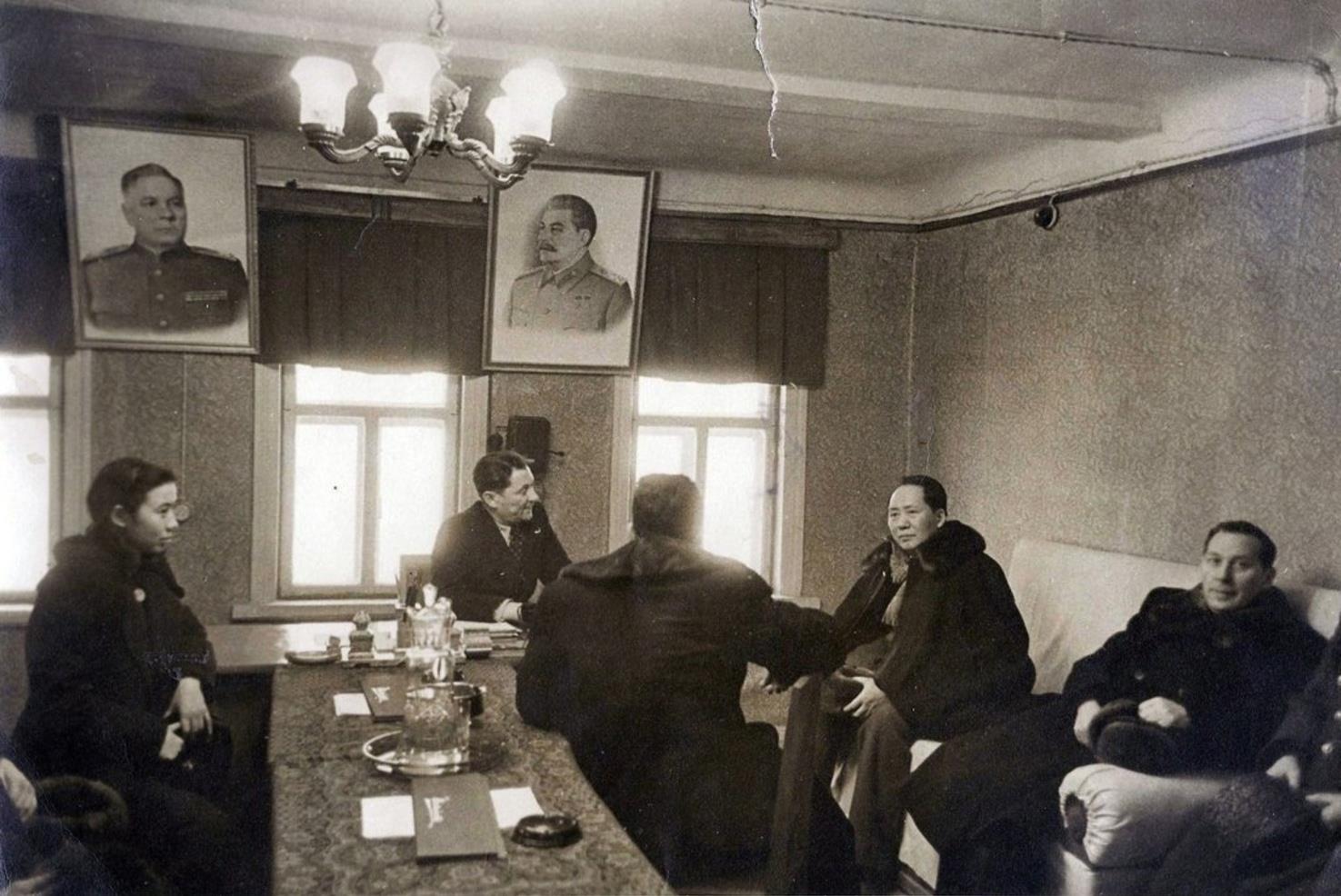 Прием китайской делегации в администрации колхоза «Завет Ильича», в центре председатель колхоза «Ленинский Луч» А. Л. Альперович, рядом Мао Цзэдун. Московская область, Красногорский район, д. Гольево, 1949 год.