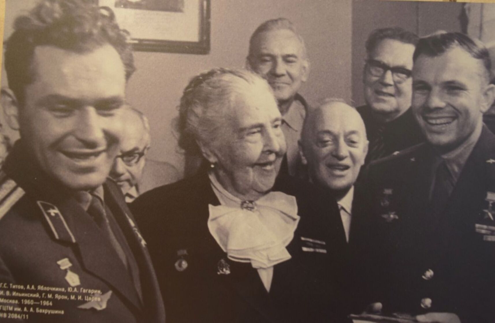 Юрий Гагарин и Герман Титов рядом с Александрой Яблочкиной и Михаилом Царёвым, 1961 г.