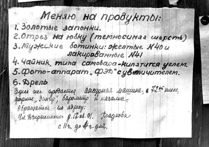 Виртуозы натурального обмена С первых дней блокады в Ленинграде выстроились очереди в военкоматы — из желающих отправиться на фронт, и в продуктовые магазины, из граждан, стремящихся сделать запасы продовольствия и других товаров первой необходимости. С полок сметали абсолютно все, но кто-то делал запасы, чтобы выжить, а кто-то для того, чтобы сделать на дефиците легкие деньги.