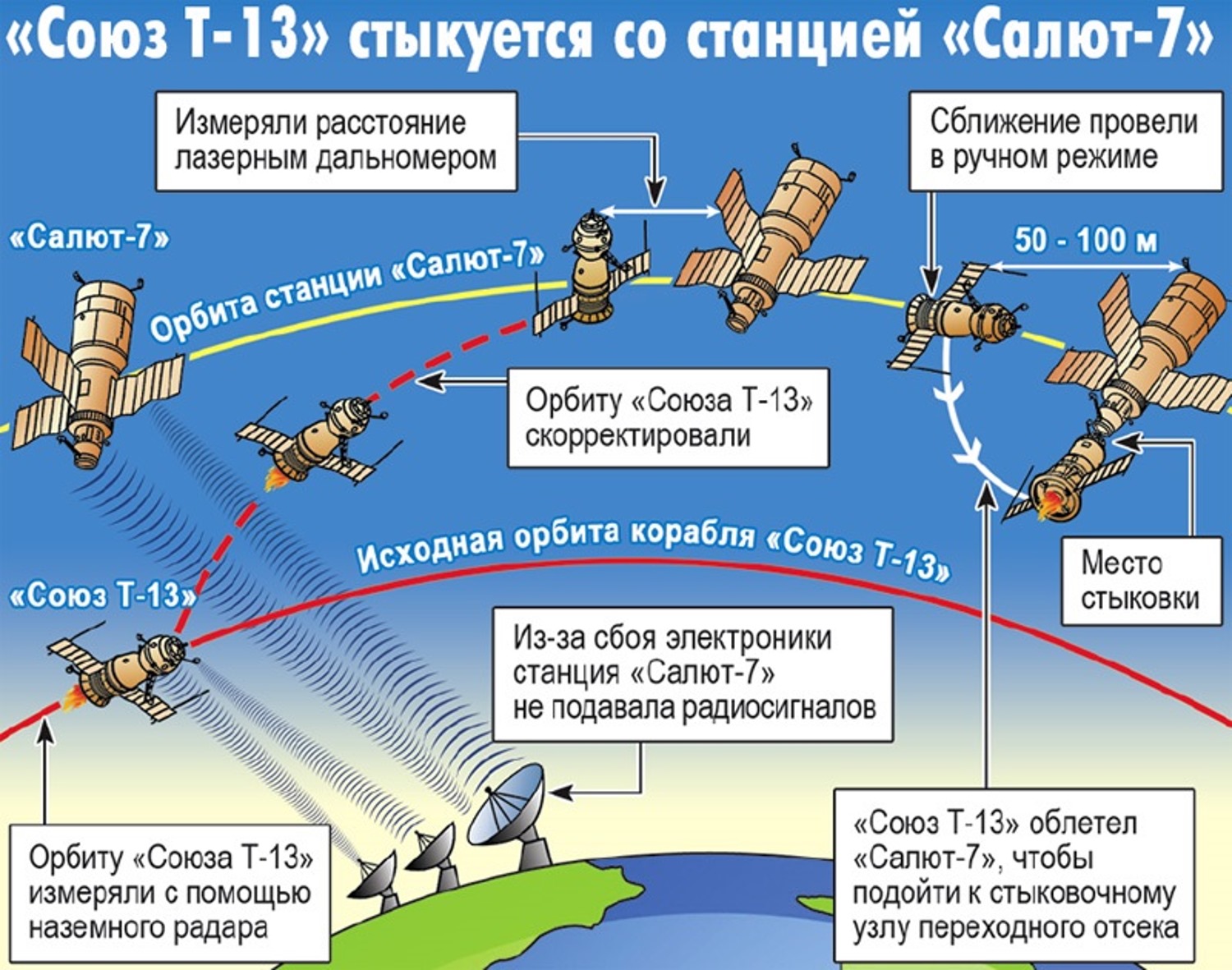 Руководивший полетом с Земли космонавт Валерий Рюмин очень точно описал сложившуюся ситуацию: космонавтам на корабле «Союз-Т» нужно было состыковаться фактически с 20-тонным булыжником, который «Салют-7» представлял собой на тот момент.