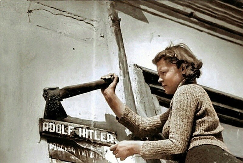 1944, март. Город Николаев в день освобождения Красной Армией. Жители снимают таблички с названием улицы Адольфа Гитлера
