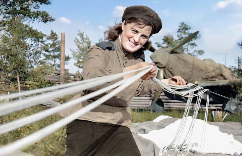 На Ленинградском фронте. Укладчица парашютов. 1944 г.