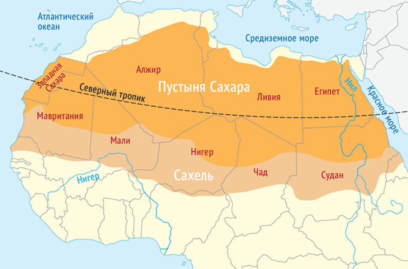 Пустыня охватывает сразу 10 стран: Алжир, Чад, Египет, Ливию, Мали, Мавританию, Марокко, Нигер, Судан и Тунис. Однако ни одно из них полностью не находится в пределах Сахары.