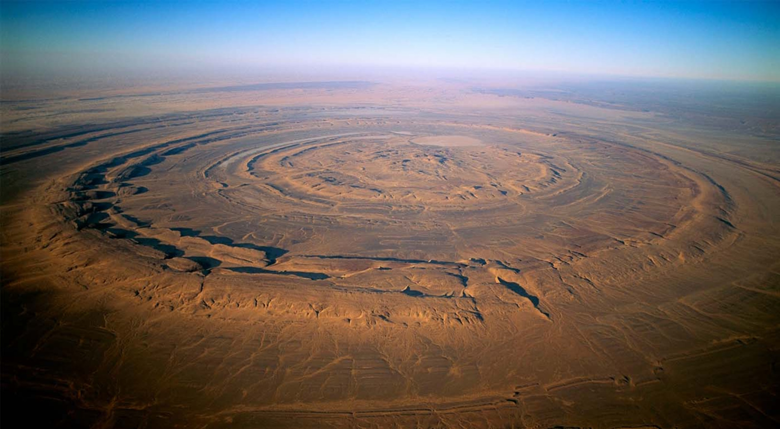 Центральная часть структуры плоская, а кольцевые гряды возвышаются на несколько десятков метров над окружающей пустыней.