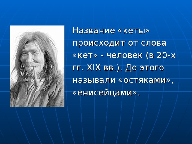 Нынешнее самоназвание кетского народа идет от единственного числа слова «дене» (люди) - кето, кет «человек».