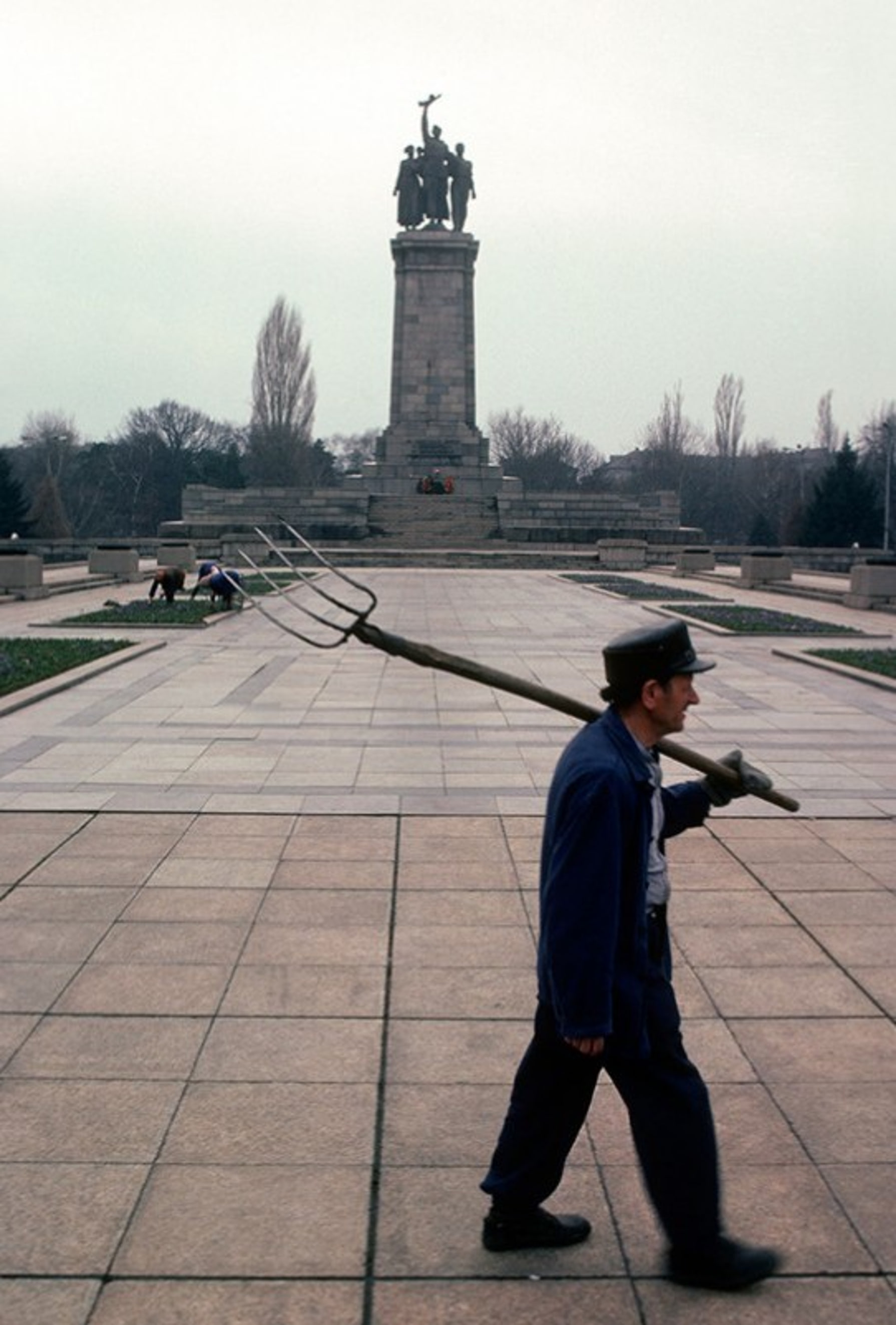 Памятник Советской армии. Болгария, София. 1985 год. [В 1993 году Софийский общинный совет принял решение по уничтожению памятника. Были и другие попытки сноса, продолжающиеся по сей день. Но как в случае с пловдивским «Алёшей» и многими другими советскими памятниками в Болгарии, попытки уничтожения не удаются. В 2011 году группа анонимных художников «Destructive Creation» перекрасила статуи солдат-красноармейцев в героев американских комиксов: Супермена, Джокера, а также в Санта-Клауса и символа сети Макдональдс клоуна Рональда Макдональда. Воспользовавшись этим, 29 июня 2011 года депутаты СДС и ДСБ внесли в Софийский общинный совет очередное предложение о сносе памятника. Голосов, поданных большинством избранников от партий ГЕРБ и БСП в конечном счёте оказались достаточно, чтобы обсуждение сноса памятника вообще не было принято на повестку дня. Памятники советской эпохи неоднократно критиковались частью болгарской общественности. Одна из причин в том, что все памятники поставлены на высокие постаменты, они выше всех остальных зданий, в том числе и православных храмов. В Болгарии строить высокие сооружения вообще считается дурным тоном. Отчасти это связано с тем, что во время правления Османской империи болгарам не разрешалось строить здания выше мечетей, то есть не более второго этажа]