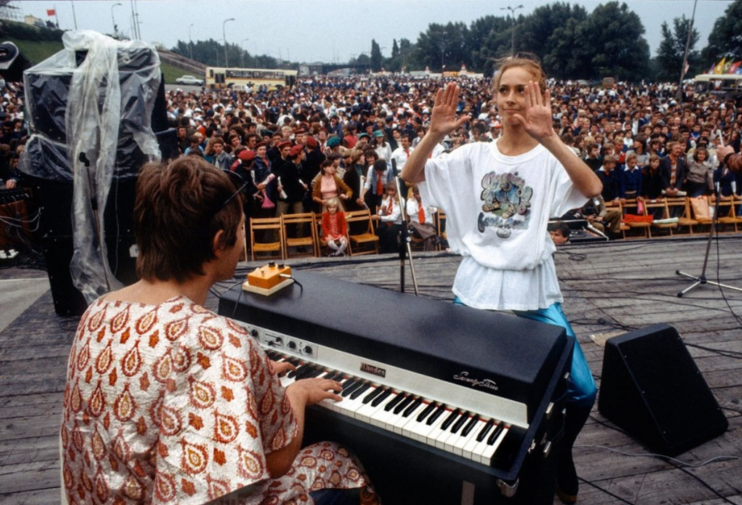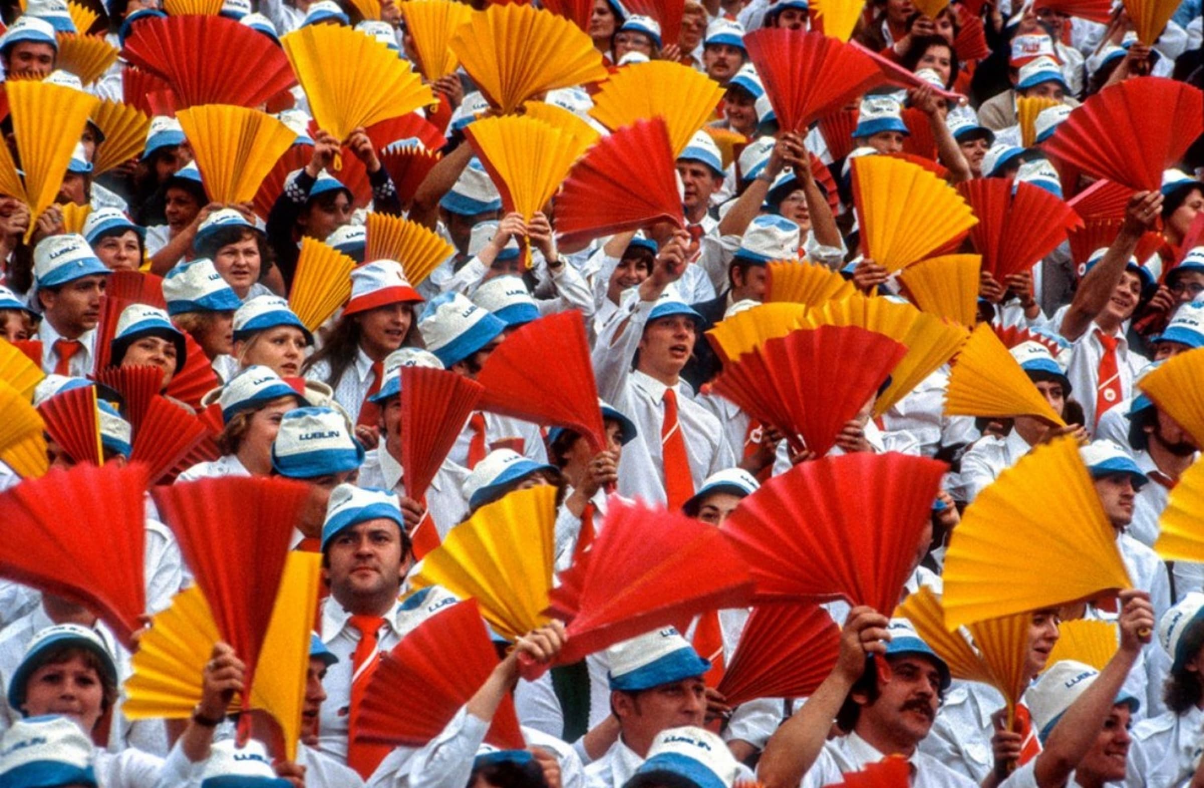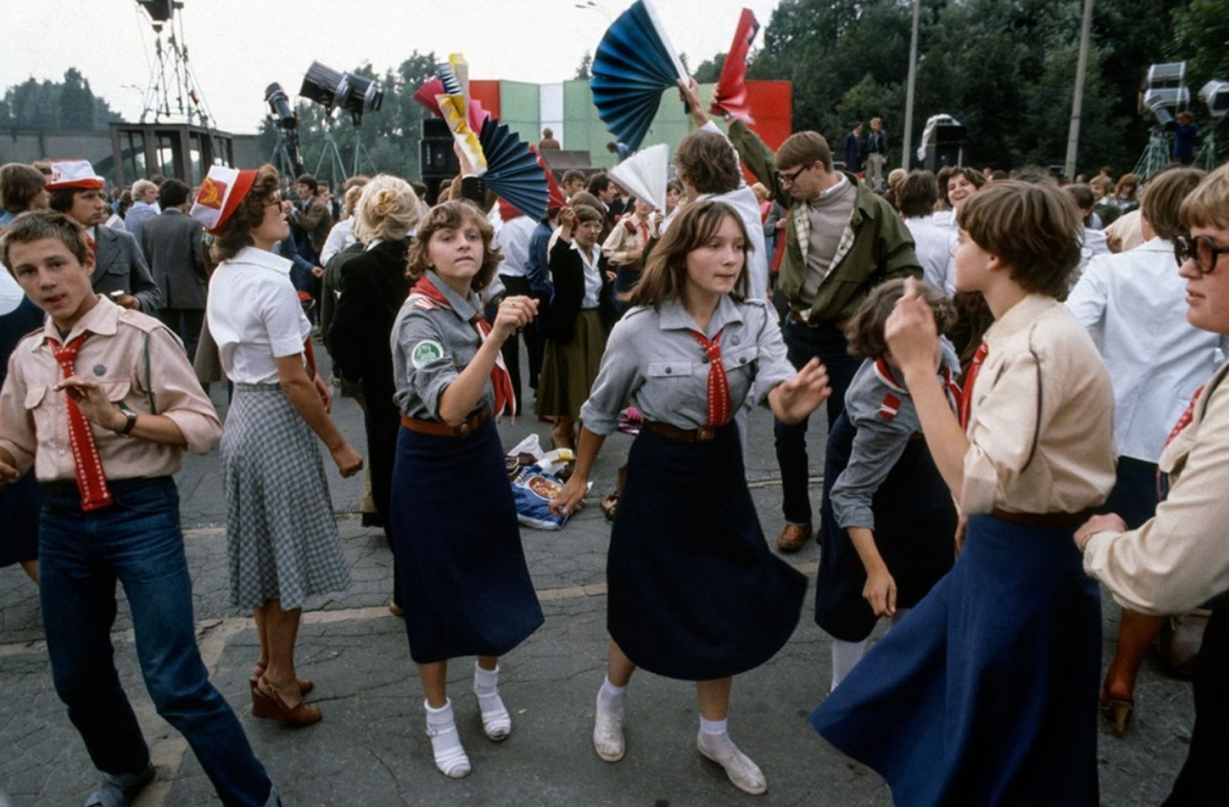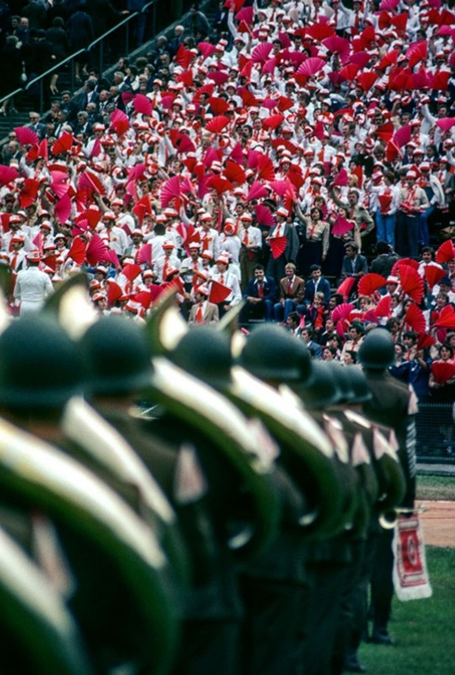 Социалистическая молодёжь на Варшавском стадионе. 1979 год. [Скорее всего, имеется в виду «Стадион Десятилетия». «Стадион Десятилетия» (Stadion Dziesiciolecia) — бывший стадион, самый большой в Варшаве, и один из самых больших в Польше, открыт в 1955 году. Во времена Польской Народной Республики это было основное место проведения партийных и государственных празднеств. В конце советского времени стадион находился в обветшалом состоянии и использовался как базар, ожидая реконструкции. После коренной реконструкции 2009—2011 годов получил название Национальный стадион]