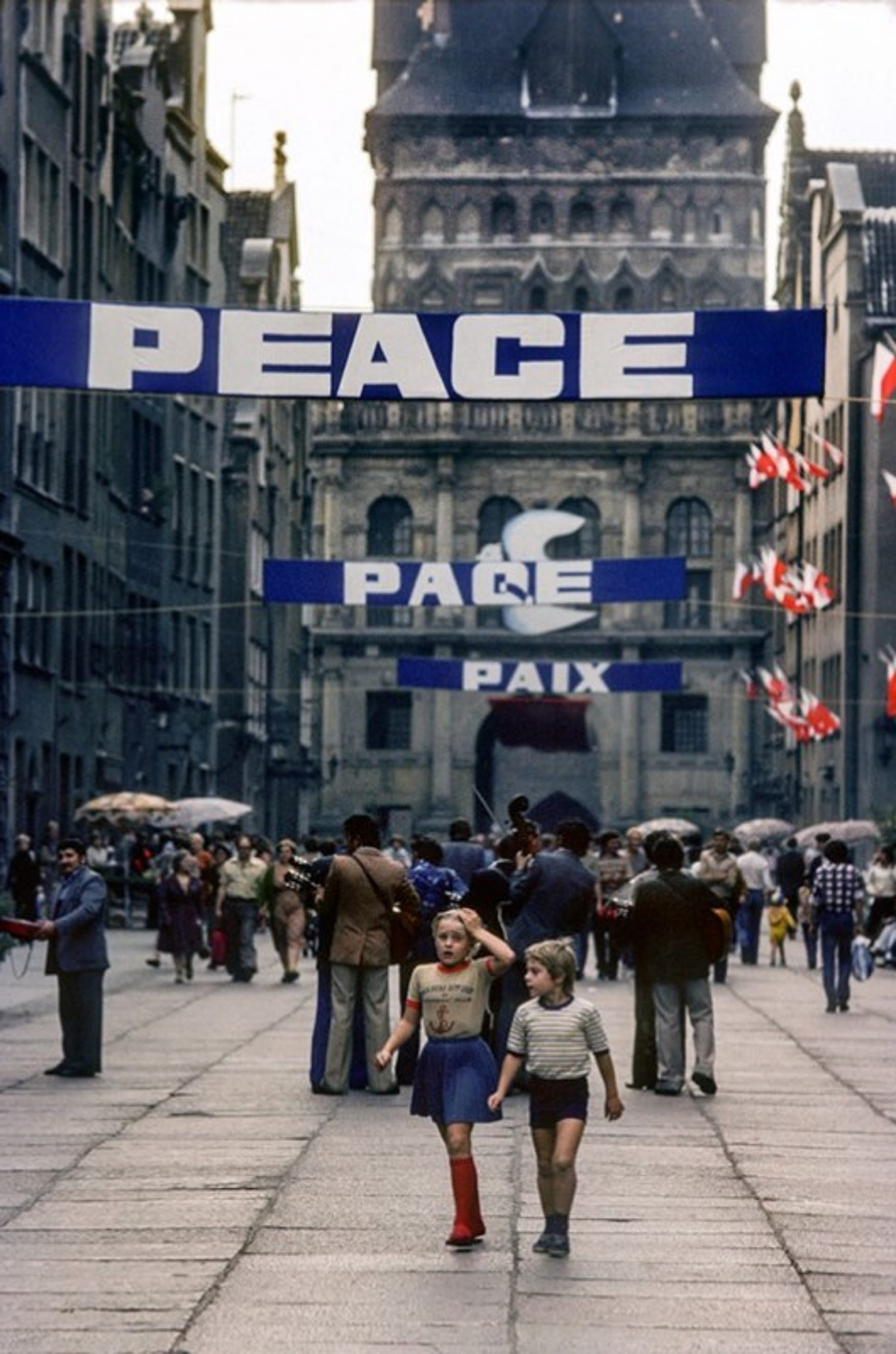 Улица Длуга (Длинная) в Гданьске. 1979 год. На растяжках транспаранты со словом «Мир» на разных языках
