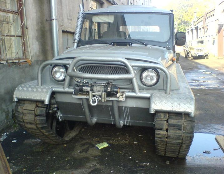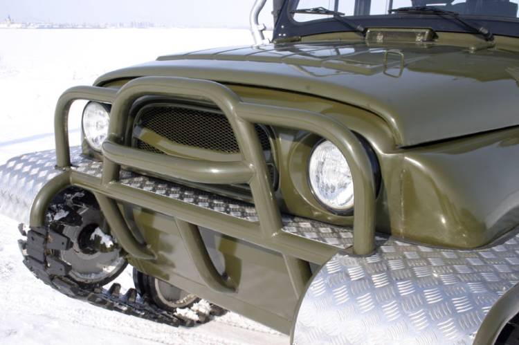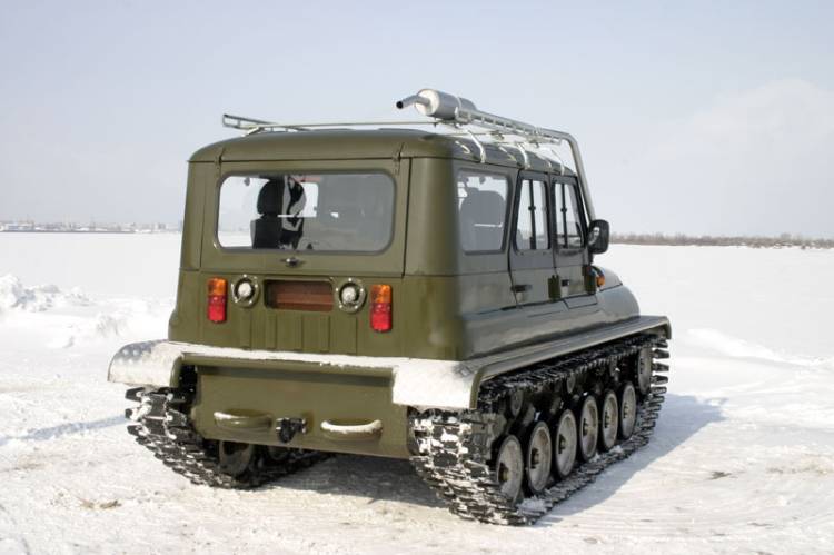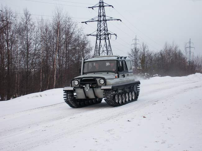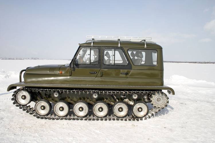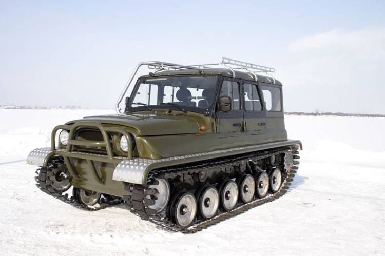 Кузов ульяновского внедорожника, разрезанный вдоль по линии излома дверных проемов, установлен на герметичный стальной корпус, в котором размещены агрегаты трансмиссии и элементы ходовой части. Каждый борт машины несет на себе две звездочки (передний ленивец и заднее ведущее колесо), шесть опорных катков с торсионной подвеской и три поддерживающих ролика. Гусеницы Ухтыша представляют собой наборные резинометаллические ленты, звенья которых соединены друг с другом специальными шарнирами. Палец-сустав, соединяющий траки, не мешает ленте работать в гусеничном обводе и свободно «наматываться» на звездочки, но препятствует обратному прогибу гусеницы — точечное воздействие со стороны опорной поверхности, таким образом, воспринимает не конкретное звено, а участок гусеничного полотна. В результате этого возникает так называемый «эффект доски», снижающий удельное давление на грунт и позволяющий машине увереннее передвигаться по слабонесущим поверхностям: песку, снегу и болоту. Равномерно распределять вес вездехода по всему пятну контакта помогают и специальные уширители — резиновые пальцы прямоугольной формы, торчащие из каждого трака. При движении по топким местам дополнительная «распальцовка» позволяет увереннее цепляться за грунт, а на плаву резиновые «пальчики» превращаются в весла.