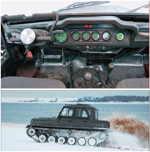 Что внутри? Да обыкновенный, милый сердцу уазик! Привыкать придется лишь к «рогатому» штурвалу, установленному вместо привычной баранки, и отсутствию педали тормоза, функции которой возложены на поворотные рычаги. Сама рулевая колонка сделана в виде Т-образной консоли, а короткие «рожки» управления бортовыми фрикционами при поворотах нужно тянуть на себя. Схема удобная, но с точки зрения эргономики консоль следовало бы сделать покороче — так будет меньше нагрузка на мышцы предплечья. В остальном же рабочее место водителя, да и интерьер в целом, вполне отвечают идеологии машины. Мягкие кресла, большие оконные проемы со сдвижными форточками, приличная обзорность... Важно и то, что, перекочевав на гусеничный вездеход, салон ульяновского «козлика» не утратил способности к трансформации — внутри можно быстро организовать два удобных спальных места. А как здесь тепло! Благодаря мощнейшей уазовской «печке» салон прогревается моментально, а водоизмещающая полость корпуса, через которую продувается горячий воздух из моторного отсека, служит таким мощным источником «подпольного» тепла, что зимой в машине можно спокойно сидеть в футболке и домашних тапочках. Мало места в багажнике? Если рассуждать с позиции геологов, нефтяников и участников экстремальных экспедиций, то это действительно так. Однако Ухтыш — это не технологический транспортер и не перевозчик промышленных грузов. Взять на борт снаряжение и провизию, необходимые для недельной «автономки» четырех-пяти охотников, он в состоянии, а если багаж не обременяет, то в салоне могут разместиться даже семь человек. Словом, Ухтыш представляет собой сугубо «гражданский» снегоболотоход особо легкого класса с соответствующей энерговооруженностью.