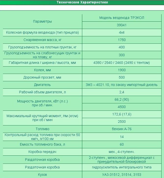 Четырехколесный ТРЭКОЛ-39041 выпускается в трех модификациях, различающихся исполнением кузова: «тентованный» (кузов УАЗ-31512), «цельнометаллический» (кузов УАЗ-31514) и «удлиненный» (кузов УАЗ-3153). Большинство узлов и агрегатов этого вездехода – стандартные изделия заводов УАЗ и ГАЗ, что обеспечивает простоту в эксплуатации, облегчает техническое обслуживание и ремонт.