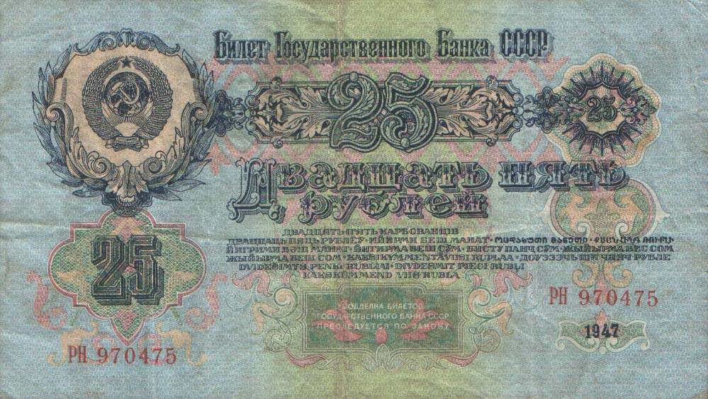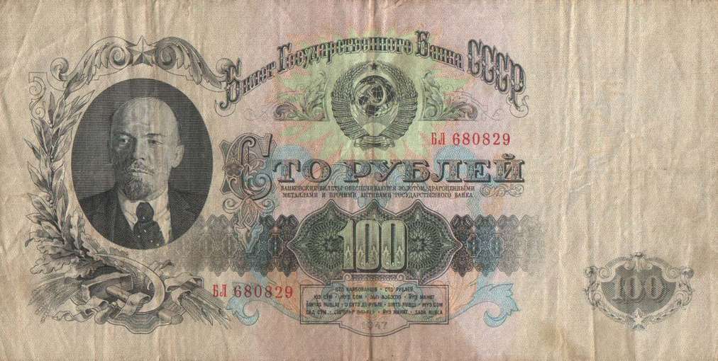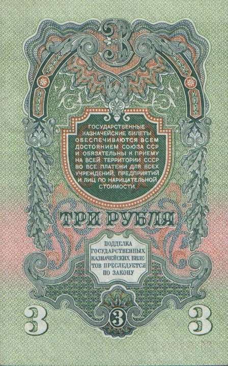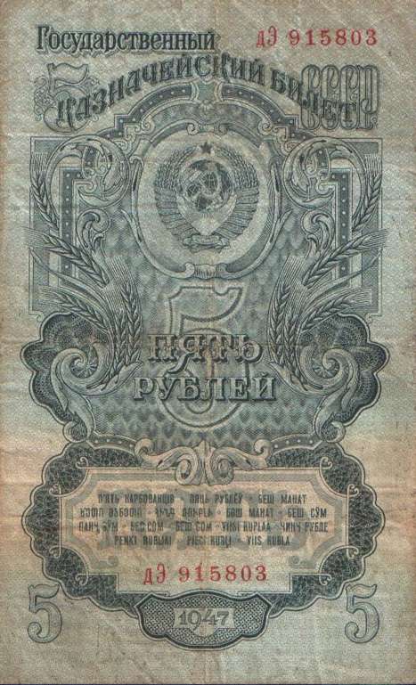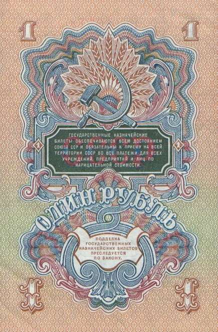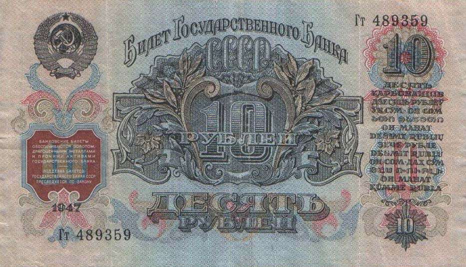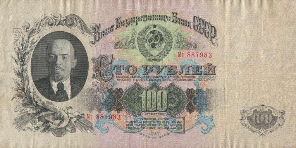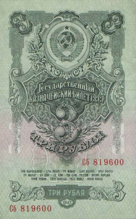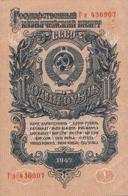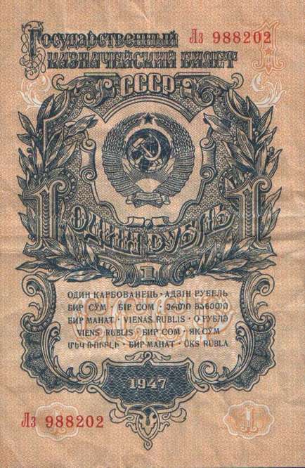 В 1934 году выпущены новые купюры 1, 3 и 5 рублей. Нумерация купюр порядковая, шестизначная, обзначение серии - одной или двумя буквами. В 1937-м был осуществлен второй выпуск этих купюр без изменения даты на них. На них не было подписей, а серии были двухлитерные. В 1937 году были выпущены новые билеты 1, 3, 5 и 10 червонцев. На них впервые был помещен портрет В. И. Ленина. В 1938 году выпущены новые казначейские билеты - 1, 3 и 5 рублей. На билете 1 рубль справа размещено изображение шахтера, на 3 рублях справа - красноармеец в походном снаряжении, на 5 рублях - летчик у самолета. Эти билеты, а также билеты прежних выпусков с 1924 года сохраняли свою платежную силу до реформы 1947 года. В период Великой Отечественной войны денежная система характеризовалась относительной устойчивостью. Население снабжалось по карточкам продовольственными и промышленными товарами по твердым государственным ценам. Однако в обращении оказались излишние деньги в результате значительного сокращения розничного товарооборота и дополнительной эмиссии. Кроме того, на оккупированной территории выпускались фальшивые деньги. Это затрудняло денежное обращение. Реформу предполагалось провести в 1946 году, но этому помешали трудности экономического характера, в частности, неурожай 1946 года. В декабре 1947 были отменены карточки на продовольственные и промышленные товары. На все товары устанавливались единые цены. Денежная реформа была проведена в короткие сроки - с 16 по 22 декабря 1947 года, а в отдельных районах с 16 по 29 декабря. Все наличные деньги обменивались из расчета 10 рублей старыми за 1 рубль новыми, а денежные средства, помещенные во вклады, переоценивались на более льготных условиях - вклады до 3000 рублей оставались без изменения. Червонцы больше не выпускались. В обращение были выпущены купюры от 1 до 100 рублей. В 1957 году в связи с преобразованием Карело-Финской ССР в Карельскую АССР в составе РСФСР выпускались купюры с 15 витками ленты на гербе вместо прежних 16. Также изменился порядок записи достоинства билетов на языках Союзных республик. Год оставили прежним - 1947.